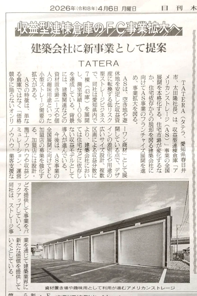 2026年4月6日発行の「日刊木材新聞」にアメリカンストレージフランチャイズ展開の記事が掲載されました。